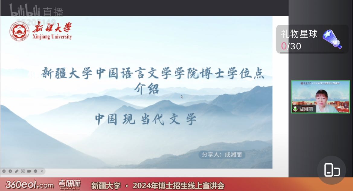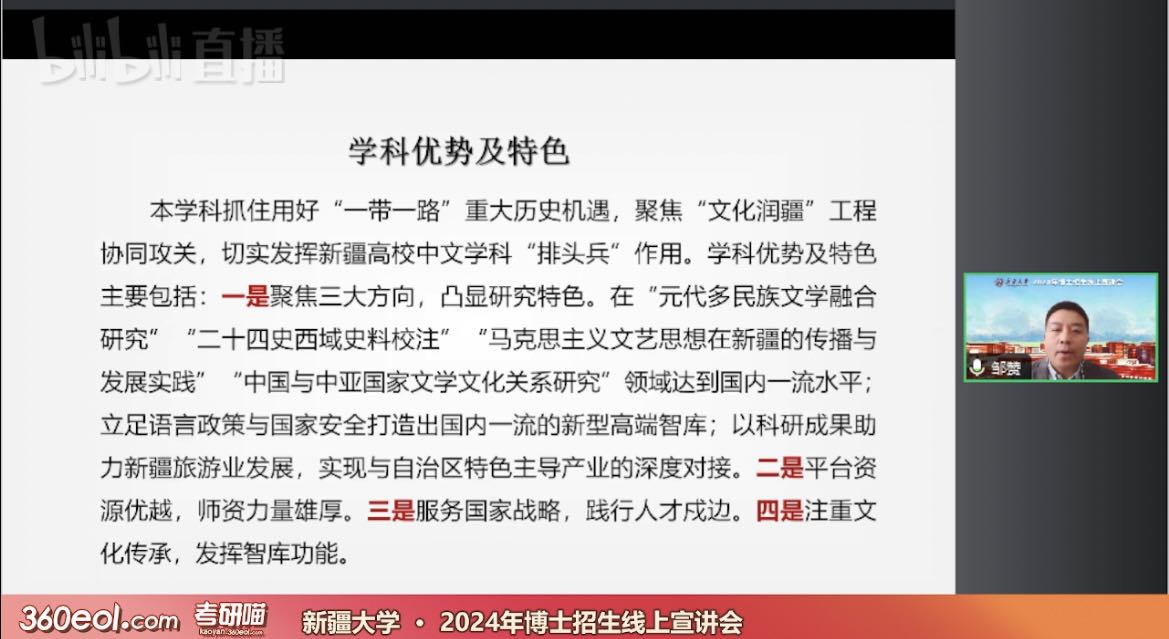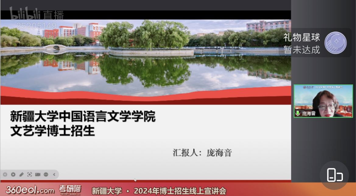 中国语言文学学科及各二级学科方向招生情况;朱贺琴教授结合自身指导博士生经验,分享学院在博士生研究生指导等方面的特色与亮点;庞海音教授与成湘丽教授分别就文艺学专业和中国现当代文学专业师资力量、课程设置、科研条件提供等进行介绍;武汉大学援疆教授、学院副院长就自己入职新大后的所见所闻,向考生和家长予以介绍,老师们的分享让考生和家长更加深入地了解国产探花